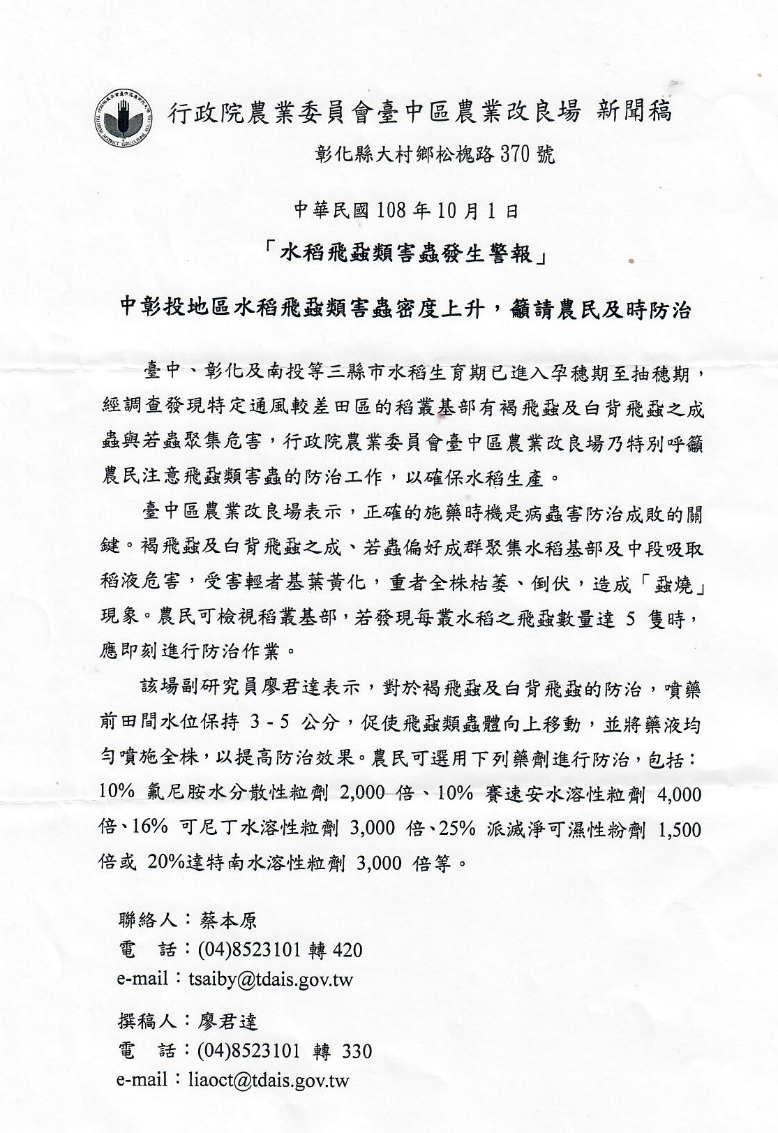 水稻飛蝨類害蟲警報
