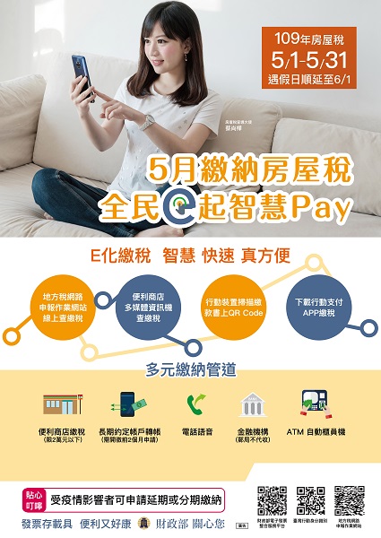 109年房屋稅於5月開徵,繳納期限為109年5月1日至5月31日(遇假日順延至6/1)