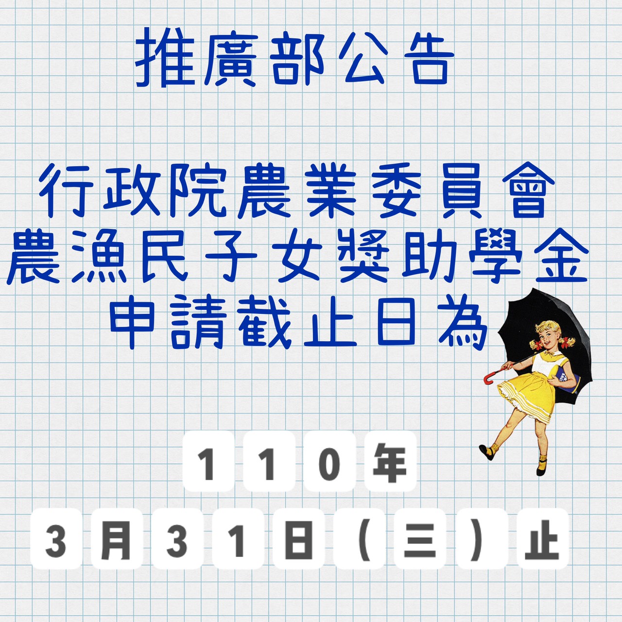 【推廣部公告】提醒農漁民子女獎助學金申請於3月31日止