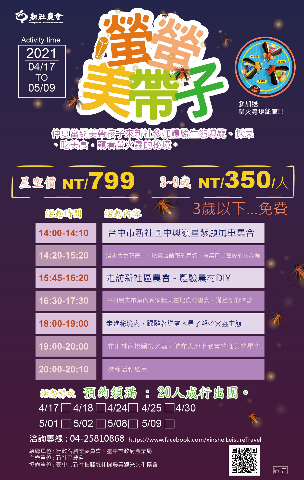 今年4/17至5/9,新社區農會定期舉辦預約賞螢活動,20人成團,詳細內容可參考以下照片,或洽電新社區農會詢問。