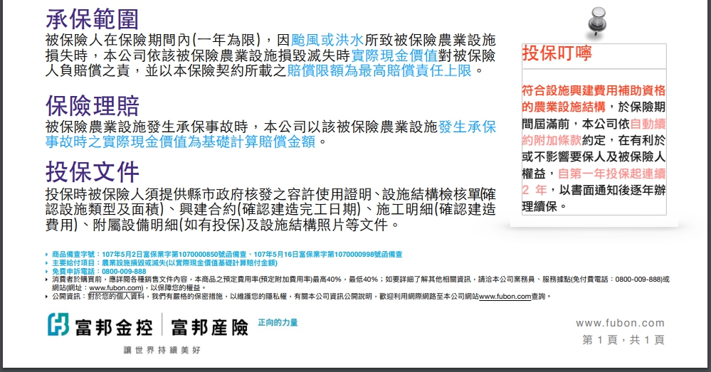 【保險部公告】農業金融局公告:富邦產物農業設施颱風洪水保險