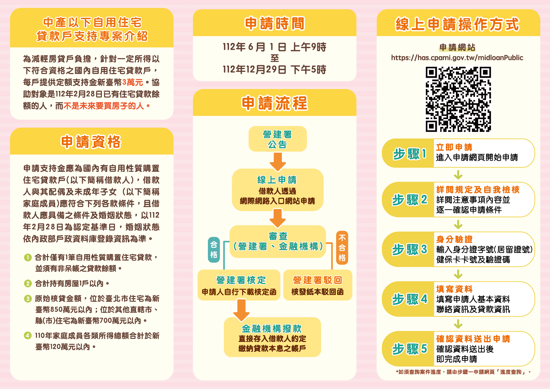 (二)線上申請:「中產以下自用住宅貸款戶支持專案線上申請網站」(網址:https://has.cpami.gov.tw/midloanPublic ,