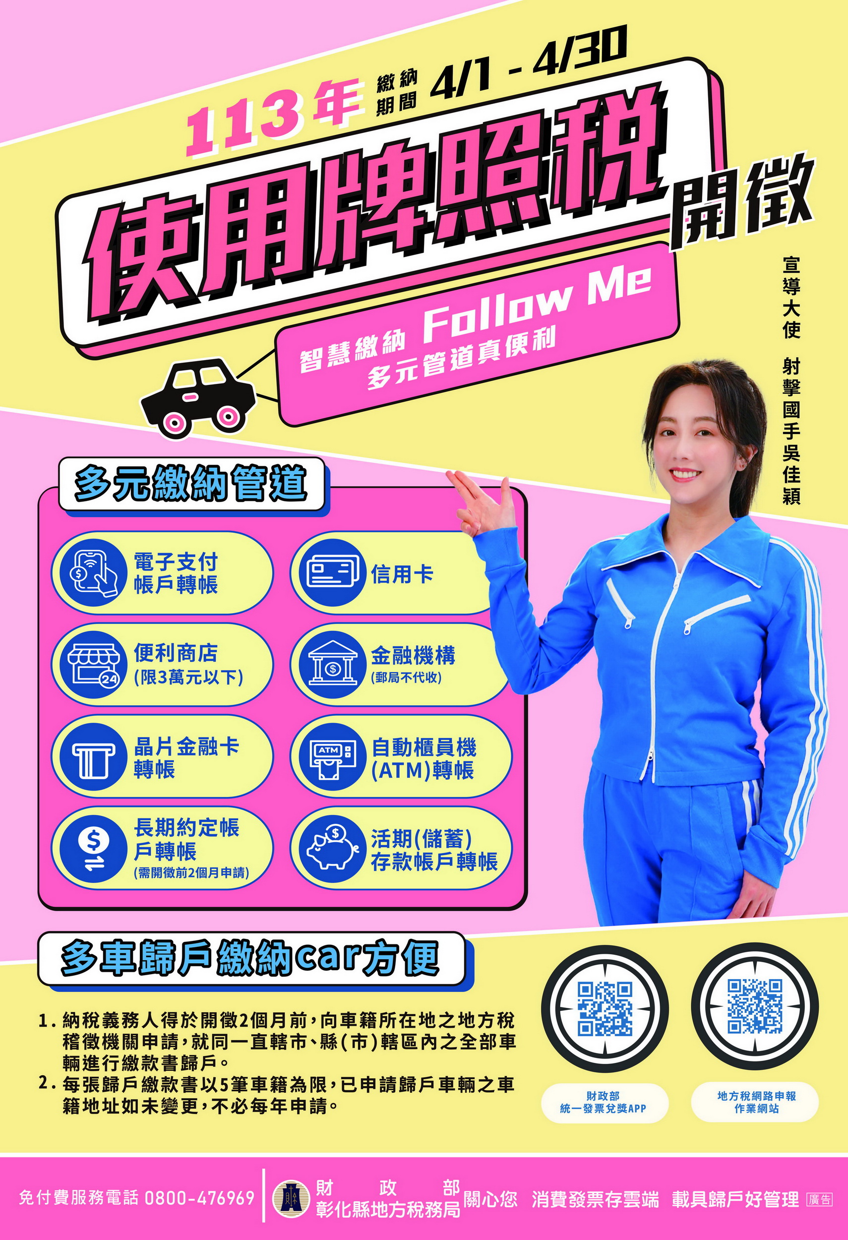 113年使用牌照稅於4月開徵繳納期間自4月1日至4月30日請如期繳納,彰化縣地方稅務局關心您