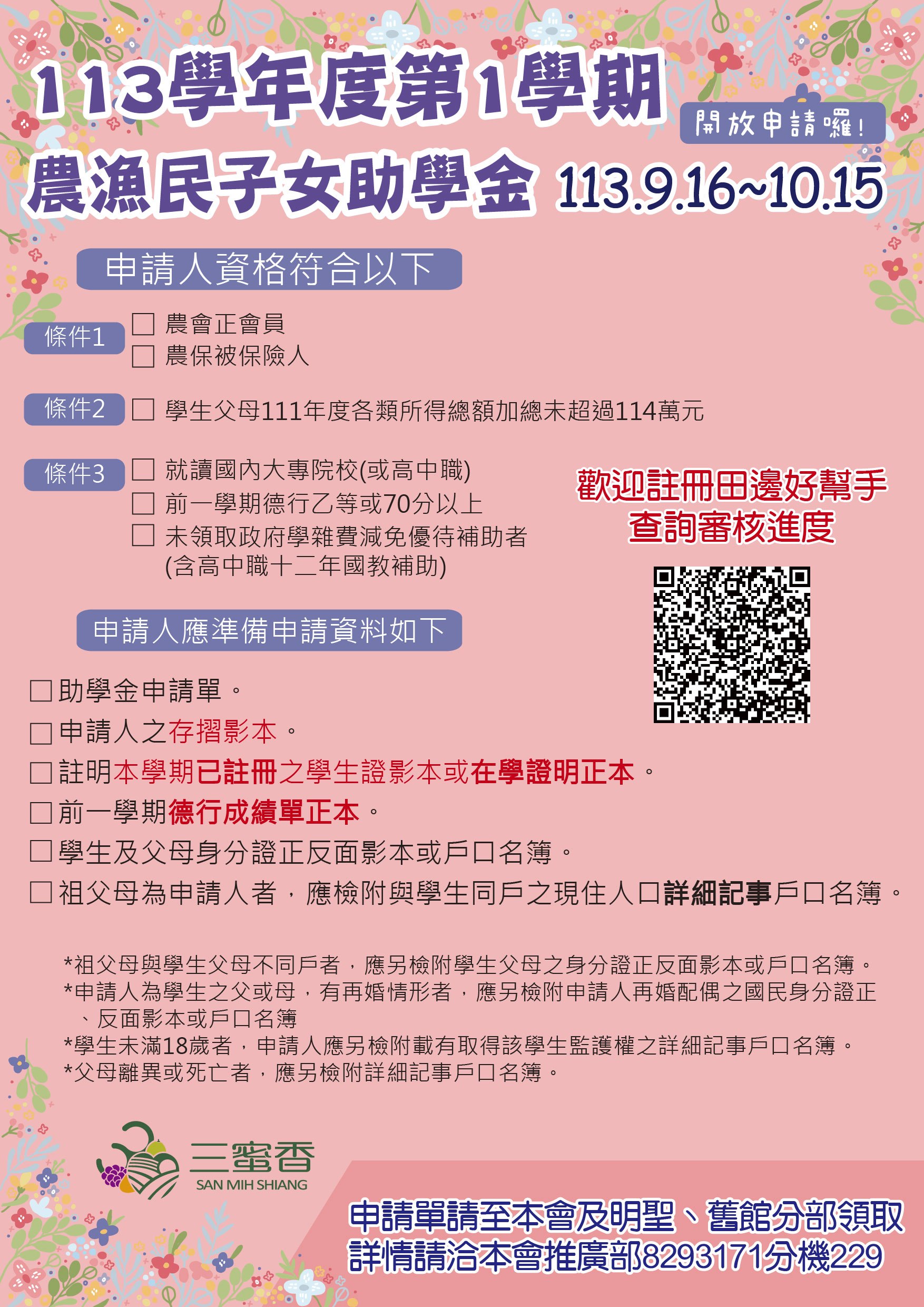 113學年度第1學期 #農漁民子女助學金 辦理時間:113/09/16至10/15申請表格下載連結:http://pushinfa.linker.tw/uploads/linkupload/adb98b82b831260f045743ca9e105164.pdf或可至本會、明聖分部、舊館分部領取詳情請洽本會推廣部 04-8293171#229