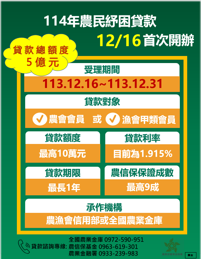 農金署說明, 113年8月19日訂定發布農民紓困貸款要點,新增1種農民紓困貸款以提供緊急金融支援。考量面對年節時刻,農漁民急需小額短期資金,首次於農曆年節前開辦,為使農漁民可於年節前取得資金,「114年農民紓困貸款」於113年12月16日開始受理申請,受理至113年12月31日截止,只要是農會會員或漁會甲類會員均可提出申請,另農業信用保證基金提供信用保證最高9成,協助擔保能力不足的農漁民增強受信能力,期能透過農民紓困貸款,緩解農漁民短期經濟壓力,安定農家生活。
