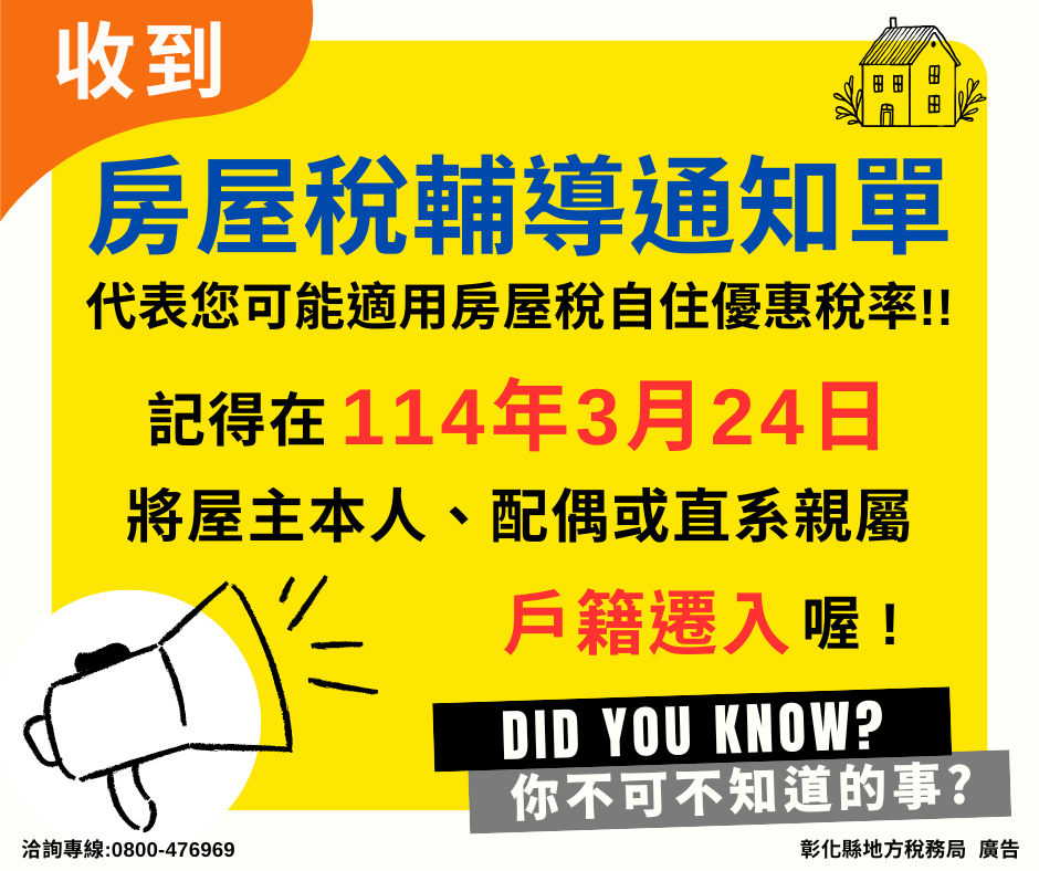 ▲ 114年如欲適用房屋稅自住房屋優惠稅率者,請盡速於114年3月24日前辦妥戶籍登記,以保障自身權益。